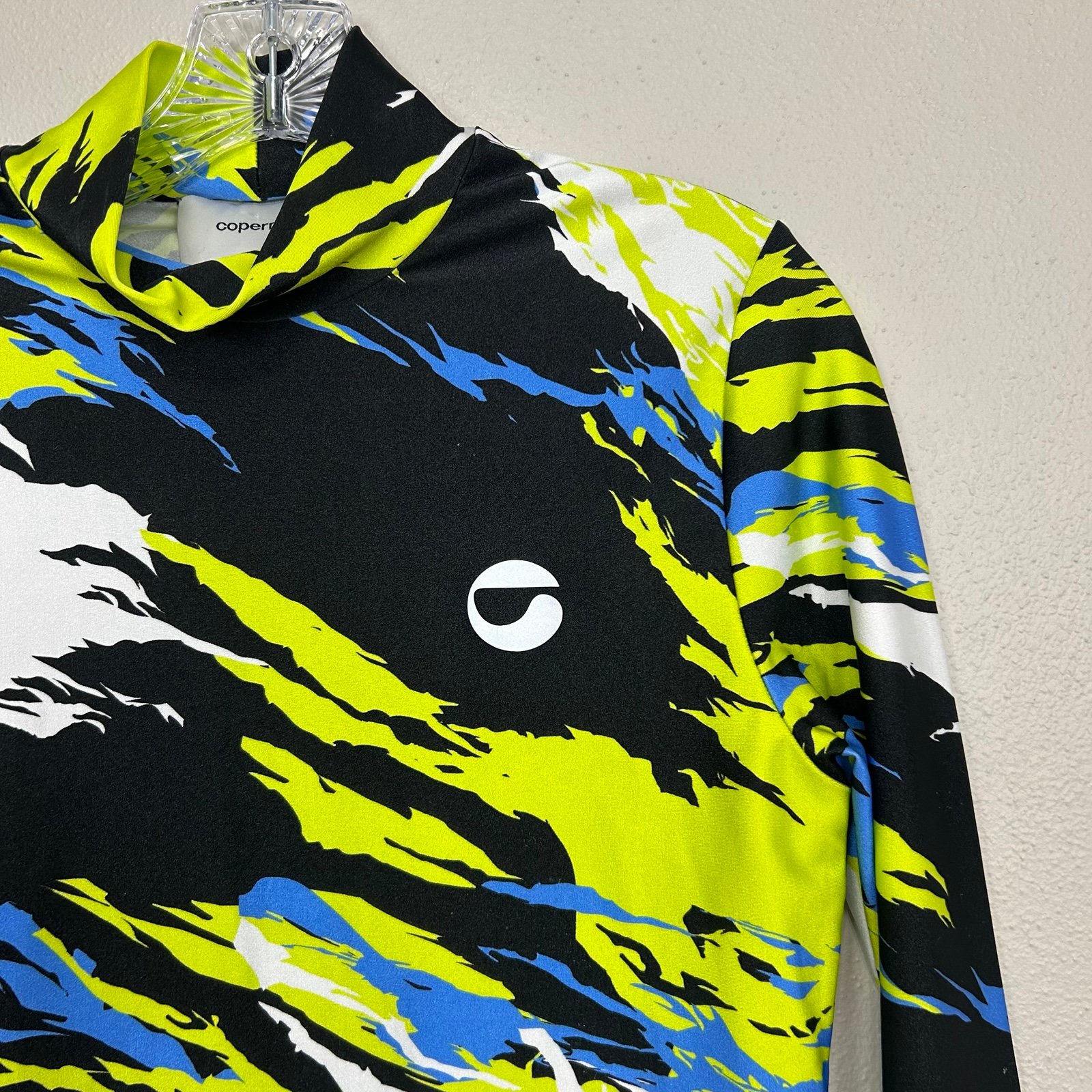 This stretch-design top from Coperni features an abstract pattern print, a logo print at the chest, a high neck, long sleeves, and a straight hem.